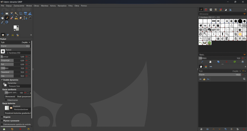 - Okno opcji narzędzia – pod przybornikiem widać dodatkowe ustawienia aktualnie wybranego narzędzia (np. wielkość pędzla, stopień przezroczystości).