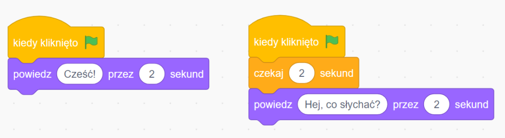 Kiedy kliknięto flagę->Czekaj 2 sekundy(pomarańczowy klocek z kategorii Kontrola) ->Powiedz [Hej, co słychać?] przez 2 sekundy. - Uruchom flagę. Widzisz? Rozmawiają po kolei!