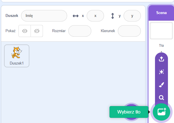W Scratchu mamy ogromną Bibliotekę (nie taką z książkami, ale z gotowymi obrazkami), z której możemy wybierać tła i postacie.