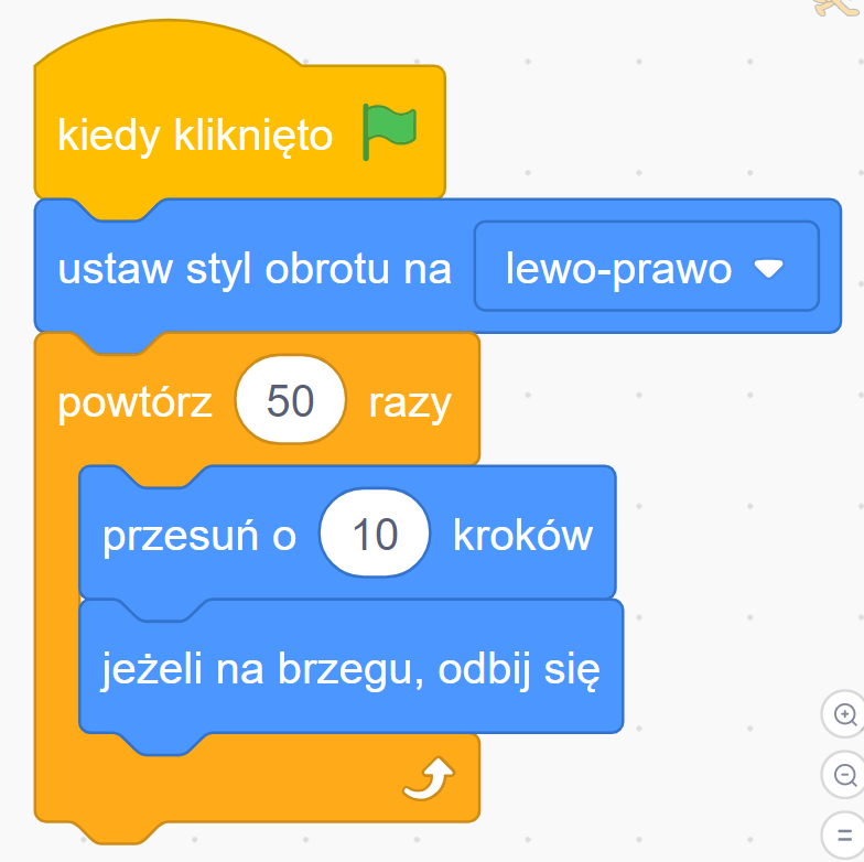 Blok ’ustaw styl obrotu — lewo-prawo’ znajdziesz w kategorii Ruch. Sprawia, że duszek może się odwracać tylko w poziomie — raz patrzy w prawo, raz w lewo, ale nigdy nie staje na głowie.