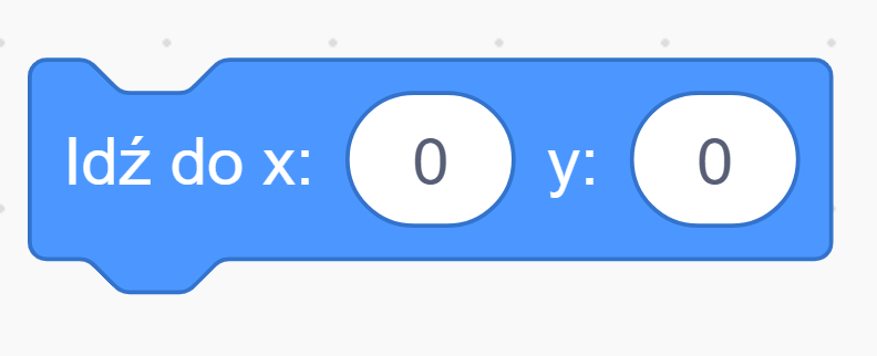 Wartości x i y możesz zmieniać — np. x: -100, y: 50 to lewa część sceny, trochę wyżej niż środek. Dokładnie czym są współrzędne x i y będziesz się uczyć w klasie 5 — na razie wystarczy Ci wiedzieć, że x: 0, y: 0 to środek sceny.