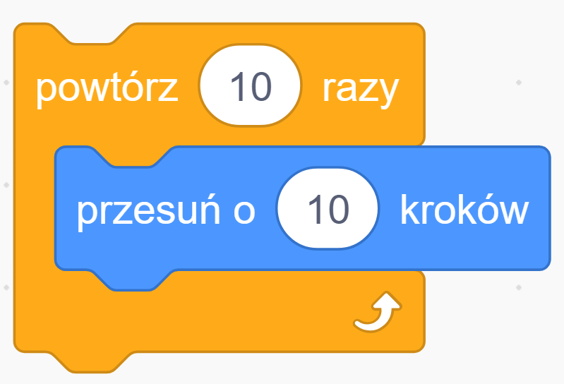 polecenie iteracyjne: polecenie, które powtarzamy wiele razy; w Scratchu służy do tego blok 'powtórz … razy’.