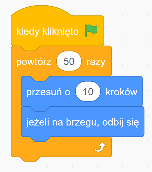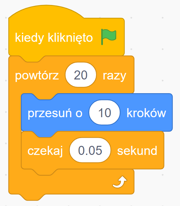 Żeby ruch był płynny (żebyś widział, że duszek naprawdę się porusza, a nie skacze w miejsca), wstaw za blokiem przesunięcia blok ’czekaj … sekund’ z wartością na przykład 0.05. To jest jak miganie klatek w filmiku — za szybkie miganie sprawia, że nie widzisz osobnych klatek.