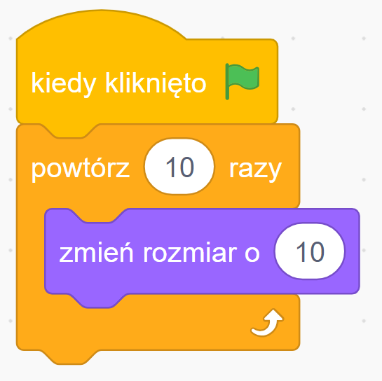 Blok ’zmień rozmiar o …’ świetnie działa w pętli. Wstaw go do bloku Powtorz 10 razy z wartością 10 — duszek będzie rósł powoli na Twoich oczach.