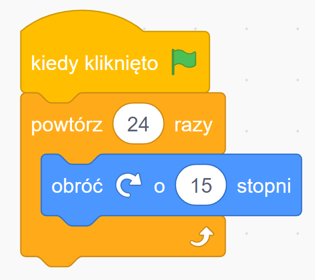 Spróbuj wstawić blok ’obróć w prawo o 15 stopni’ do pętli 'powtórz 24 razy’ — duszek zrobi pełny okrąg (24 × 15 = 360 stopni)!