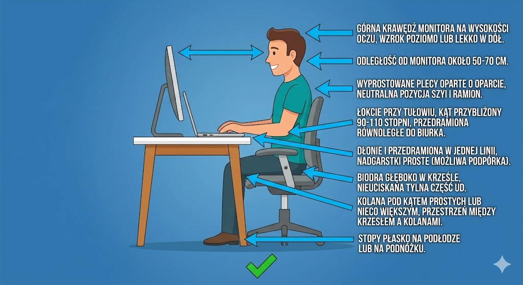 Wyobraź sobie, że spędzasz godzinę w fotelu z głową przekrzywioną w lewo. Po chwili boli Cię kark. Tak samo działa praca przy komputerze — zła pozycja po kilkudziesięciu minutach zaczyna dawać o sobie znać.