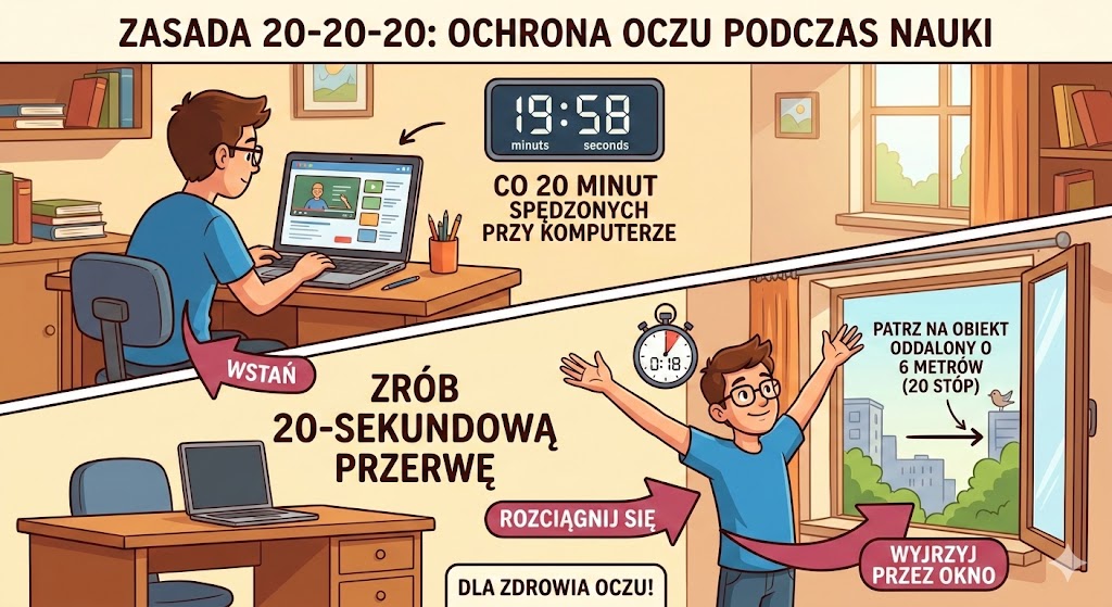 Zasada 20-20-20 to prosta metoda, którą polecają okulisty: co 20 minut patrz przez 20 sekund na coś w odległości co najmniej 6 metrów — np. przez okno na budynki lub drzewo za oknem. To pozwala mięśniom oka się zrelaksować.
